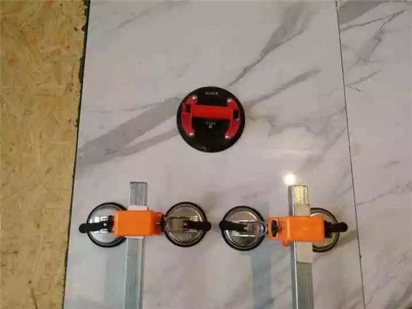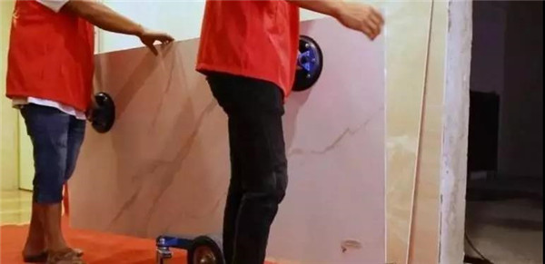 大板比较大!不是你说搬就能搬的!工欲善其事必先利其器!相对于小砖,大板需要专用的搬运和粘贴工具的。提前准备搬运轮、移位器、搬运吸盘等工具,用专业的工具将大板搬运到施工位置,或者用吸盘、搬运杆搬运大板,移动大板的时候可以借助移动架来搬运,这样才会省力又省时间,还防止了大板瓷砖的破损问题。