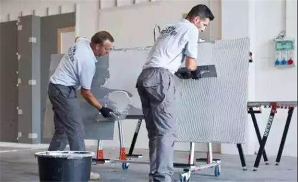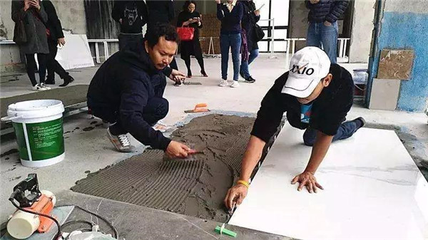 大板瓷砖的受力面积很大,一定要保证大板在铺贴的时候保证的平的,不能高低不等,另外一定要让大板与瓷砖胶充分结合,否则出现不平或者空鼓,这对于铺贴都是很致命的。将瓷砖平整地铺贴在基层上,使用震动器将瓷砖拍实铺平,便于排出气泡,提高砖底满浆率,以免产生空鼓现象。用振动器把砖面敲平整的同时,以水平尺测量,确保瓷砖铺贴水平。