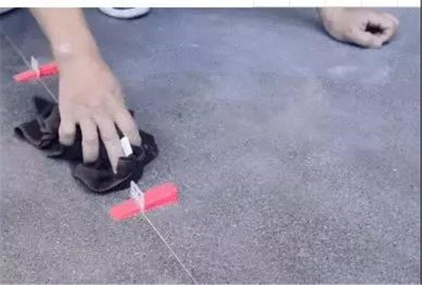 找平是个很关键的步骤,因为大板现在还没有国家标准,现在平整度多少目前还没有定数,一定要使得大板在变形之前做到找平。使用找平器,做好大板的压平,在已定位好的大板边缘每隔60cm插入找平器底座,检验平整后插入找平楔子并夹紧找平器,调节相邻大板的表面平整度,并将大板间隙调整为2mm左右,以便后续美缝剂处理。这样,铺贴出来的大板瓷砖,才美观。