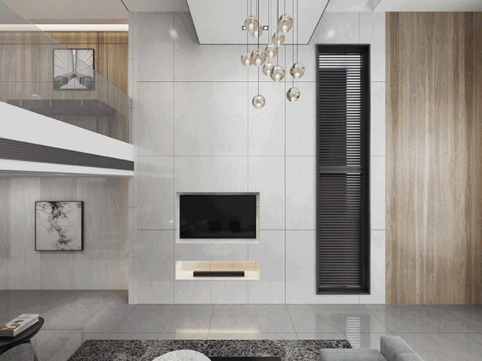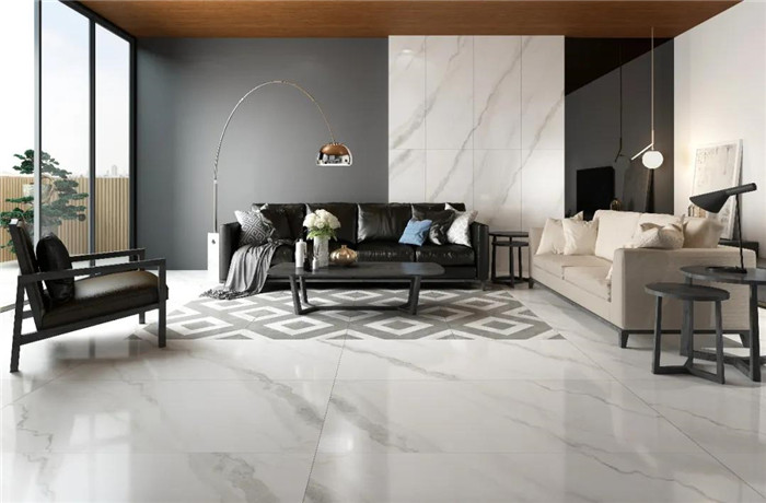 白色,带来干净、清新、明亮的视觉感受。对于空间较大的户型,客厅、卧室大规模运用750 X1500mm的地砖会显得更加优雅大方。